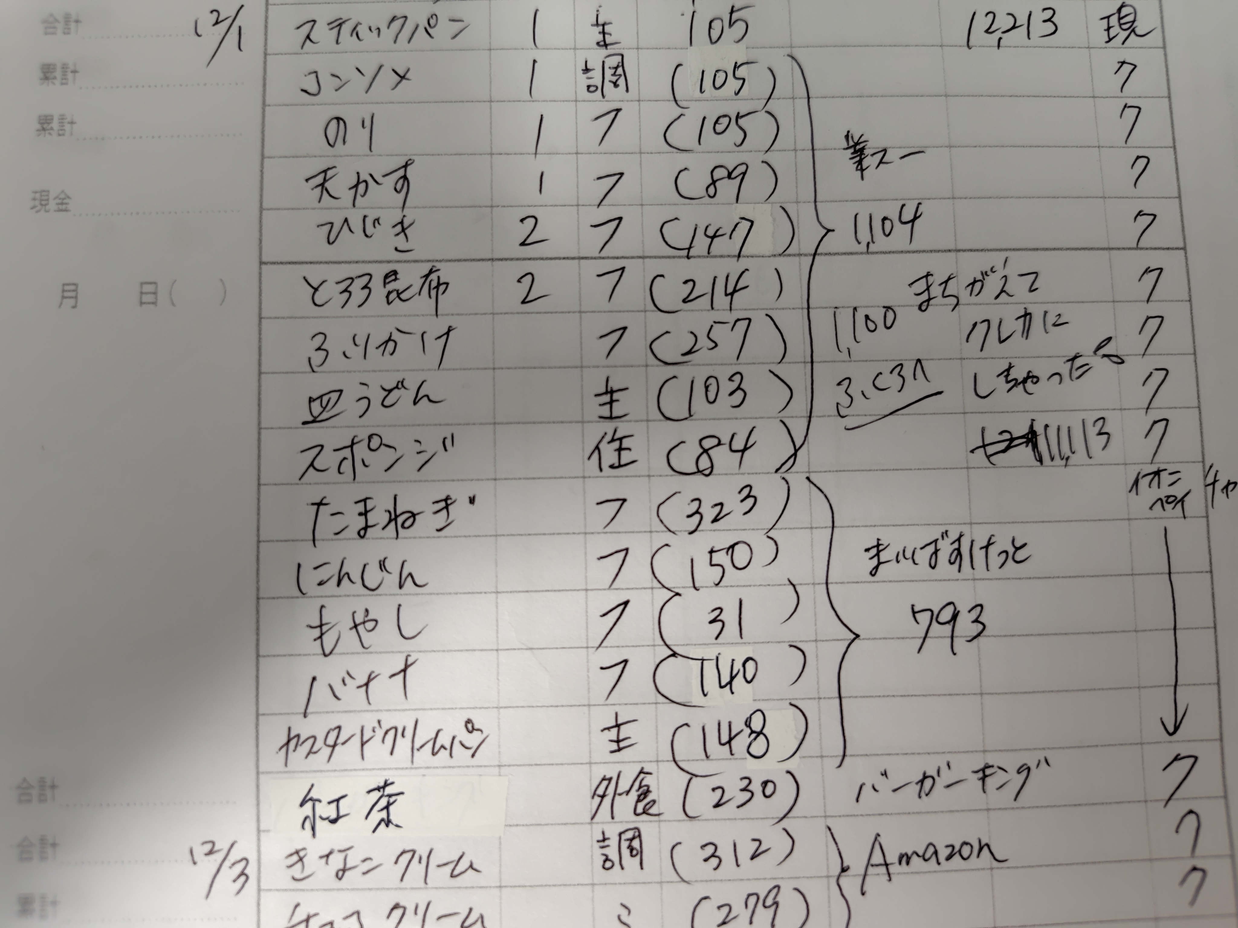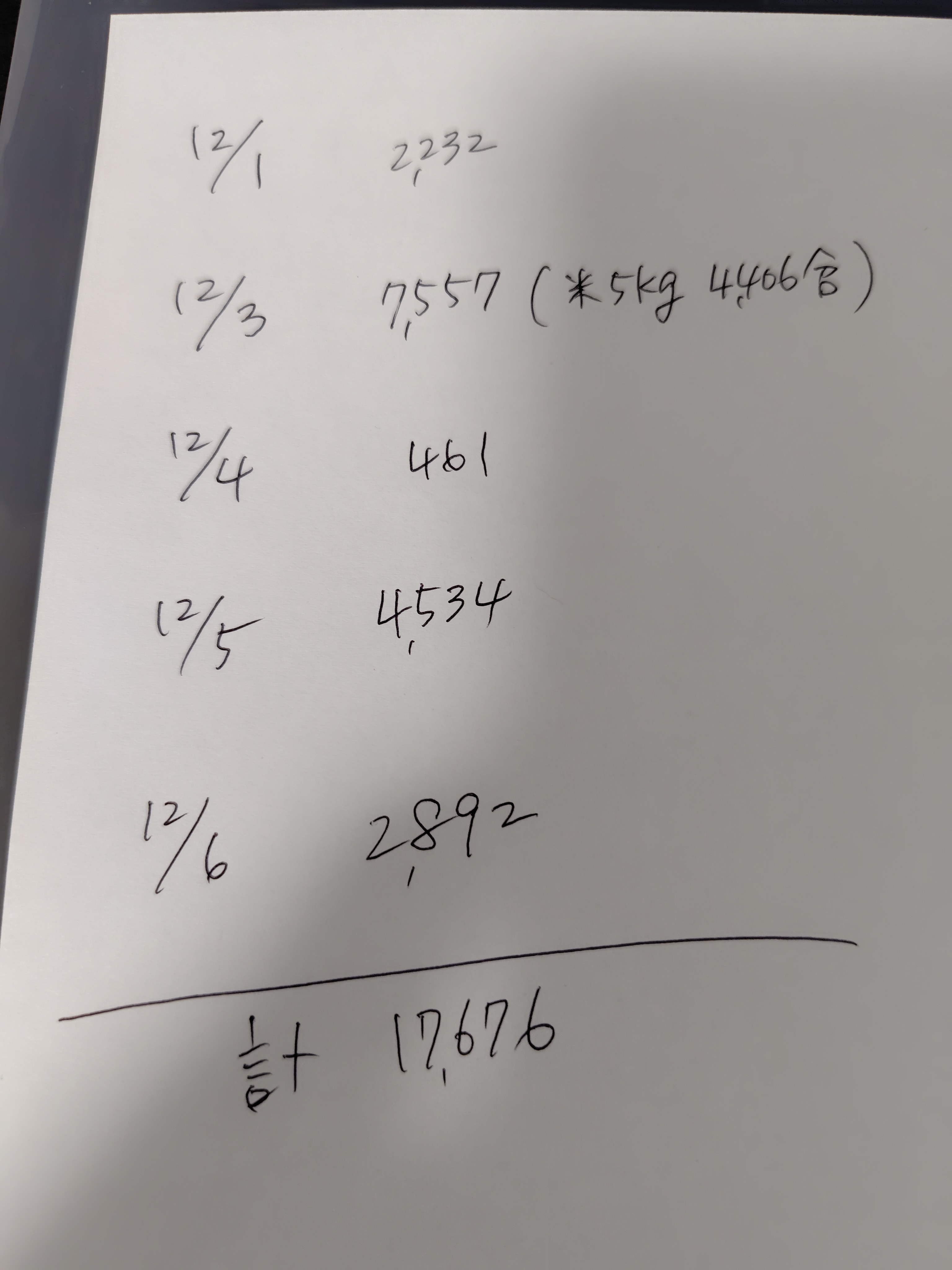ひとまず12月1日から7日までの一週間の支出を公開します。